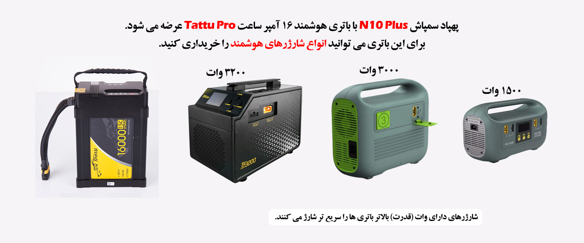 باتری: لیتیوم‌پلیمری 12S با ظرفیت ۱۶۰۰۰ میلی‌آمپر ساعت (16Ah) کابلی هوشمند با نمایش درصد باتری (تعداد انتخابی)