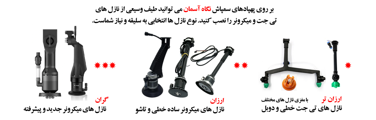 انواع نازل میکرونر گریز از مرکز و تی جت قابل نصب بر روی پهپادهای سمپاش نگاه آسمان